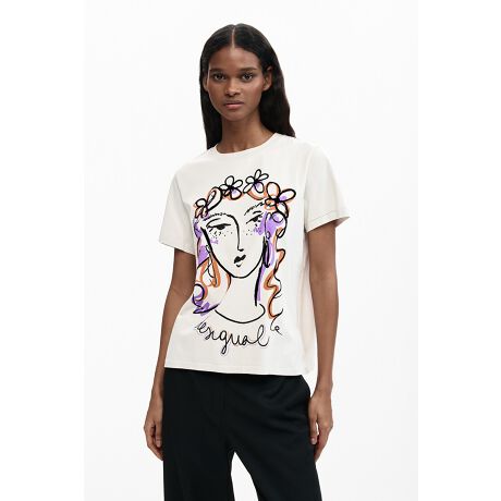 前面に女性の顔と髪の花のプリントが入ったジャージーTシャツ。クルーネック、半袖。コットンとエラスタン混紡のジャージー生地。