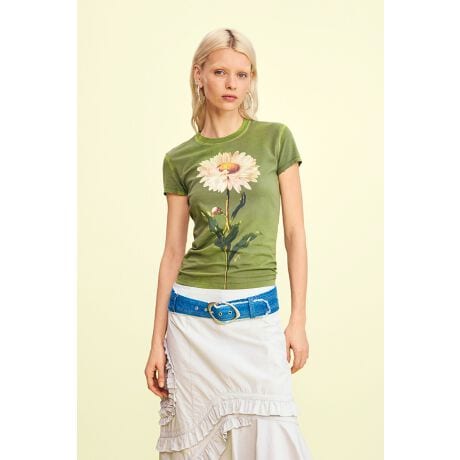 コットンジャージーTシャツ、前面にデイジーのプリント入り。クルーネックでフィット感のある半袖。見える留め具のないストレートヘム。