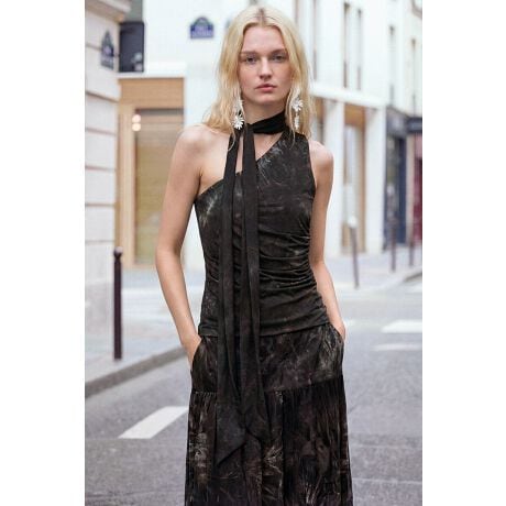 伸縮性のある生地を使用したタイトフィットトップスで、アシンメトリーなワンショルダーとスカーフ付きのデザインが特徴です。滑らかな肌触りと、片側がノースリーブになった構造の一着です。