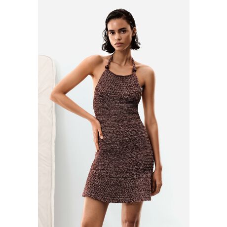 ホルダーネックデザインのシンプルなサマーニットドレス。
