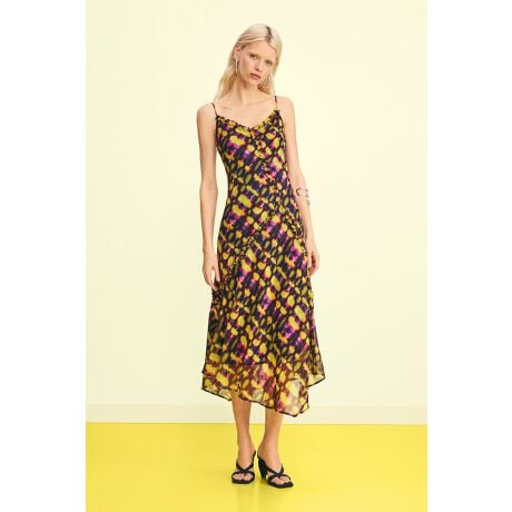 パープルとマスタードのサイケデリックなタイダイ柄がプリントが施されたミディロング丈ワンピース。細いストラップとフリルが特徴。さらっと一枚でリゾートスタイルはもちろん、デニムやインナーをレイヤードするスタイリングもおすすめ。