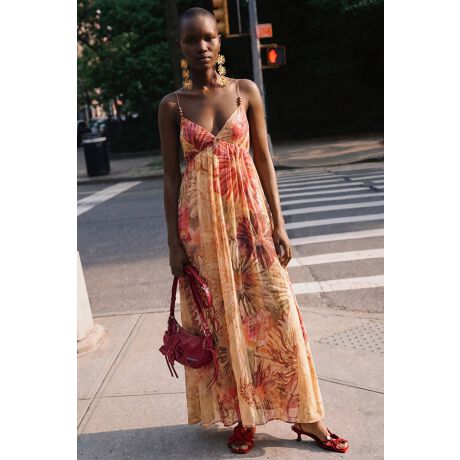 リゾート感のある大判で華やかなフラワー柄をあしらった、キャミソールタイプのワンピース。ショルダーストラップのビーズがポイント。バスト下からしっかりとフレアが効いており、リラックス感のあるデザイン。インナーやカーディガンをレイヤードするのもおすすめ。