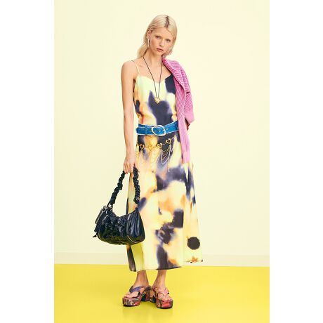 イエローのインクが滲んだ模様が全面にプリントされたキャミソールタイプのワンピース。一枚ではもちろん、インナーやボトムをレイヤードした着こなしもおすすめ。