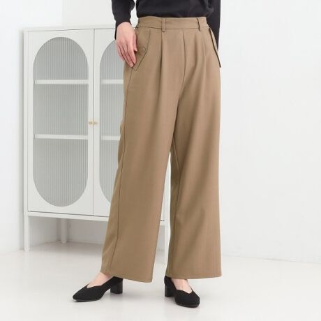 縦ラインがすっきり見えするへリンボーン素材のワイドパンツ。