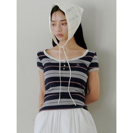 ピタッとフィット感を出してお作りしたカットソー生地のヘンリーネックTシャツです。伸縮性があり、着心地の良い素材を使用。左胸にSNIDELエンブレム刺繍のワンポイントを入れました。襟ぐりにはテープレースをあしらっているのでカジュアルになりすぎず、フェミニンなお洋服とも相性抜群です。襟ぐり広めでデコルテラインをキレイに演出。フロントの3つの小粒貝ボタンがアクセントに。