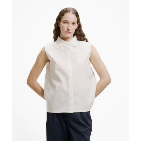 [型番:CF007J-99]ポロシャツのディテールとドレスシャツのエレガンスを合わせたノースリーブシャツ・わずかにポリウレタンを混ぜたストレッチコットン素材・フェミニンな弱Aラインシルエット・エレガンスを演出する背面襟元のタックフレア・襟はポロシャツライクなリブニットで切り替えにRegular Fit