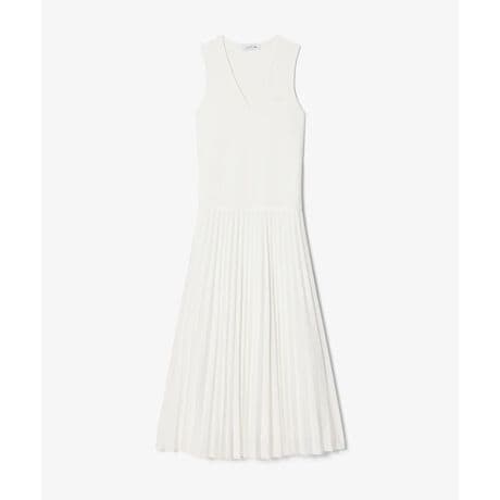 [型番:EF8849-10]テニス由来のプリーツをエレガントにアレンジしたVネックスリーブレスロングドレス・環境保全に配慮したリサイクルポリエステル仕立てのジャージ素材・フェミニンなデコルテラインを演出する深めのVネックデザイン・エレガントに揺れるロング丈のプリーツスカート・ウエストバンドにエンボスのブランドネームロゴ・左胸にボディと同色のワニロゴパッチ・Regular Fit