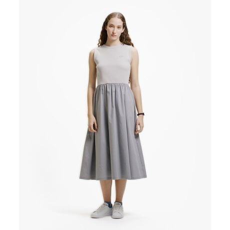 [型番:EF041J-99]異素材コンビで魅せるフィット&フレアのノースリーブマキシドレス・上身頃はコットンリブニット素材、スカート部分はコットン×ポリエステルの布帛素材・上品なフェミニンを演出するウエスト切り替えのフィット&フレアシルエット・両腰脇にハンドウォーマーポケット付き・左胸にボディと同色のワニロゴパッチRegular Fit