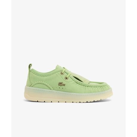 [型番:51SFA0121]トラディショナルな革靴のスタイルを、ポップなカラーとスニーカーソールでアレンジしたレディースモデル・マットな表面感が際立つヌバックレザー・クラシカルなモカシンステッチと、洒落感あふれる飾り切り・クロコレザーの表情を再現したエンボスレザーフリンジパネル・サイドに金属製のワニロゴプレートを配置