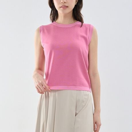 調温機能糸を使用した、ノースリーブニットプルオーバー。細番手の糸で編み立て、春夏仕様のさらりとした肌触りに仕上げています。シンプルながらきちんと感のある表情で、一枚でも上品に着用できるデザイン。同素材カーディガン(30-61-14-916)と合わせてアンサンブルとしても楽しめ、単体でも幅広いスタイリングに活躍します。