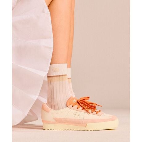 [型番:51SFA0074]クラシカルなスタイルにラコステのアイコンを重ねたレディースレトロスニーカー・表革とスエードを組み合わせたコンビアッパー・アッパーに装飾ステッチを効かせたクラシックな切り替えデザイン・ミッドソールとアッパーの継ぎ目に配したテキスタイルバンド・シュータンにラバープリントのラコステ テニス ブランドネームロゴ・サイドパネルにワントーンの金属製ワニロゴプレート