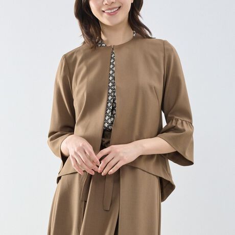 ツイル織りの素材を使用した、袖フリルノーカラージャケット。今シーズンは新たなカラー展開に仕上げ、ソフトな風合いの生地でよりきちんと感を引き立てています。袖のギャザリングや前身頃から後身頃にかけての緩やかなラインなど、細部までこだわったデザインが魅力。同素材ボトム(30-61-08-740、30-61-09-741)と合わせてセットアップとしても着用でき、オンオフ問わず活躍する一着です。