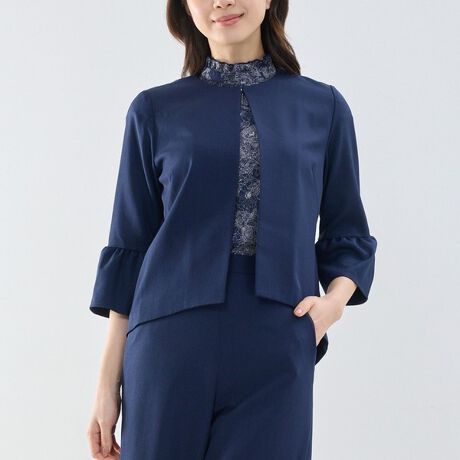 ツイル織りの素材を使用した、袖フリルノーカラージャケット。今シーズンは新たなカラー展開に仕上げ、ソフトな風合いの生地でよりきちんと感を引き立てています。袖のギャザリングや前身頃から後身頃にかけての緩やかなラインなど、細部までこだわったデザインが魅力。同素材ボトム(30-61-08-740、30-61-09-741)と合わせてセットアップとしても着用でき、オンオフ問わず活躍する一着です。