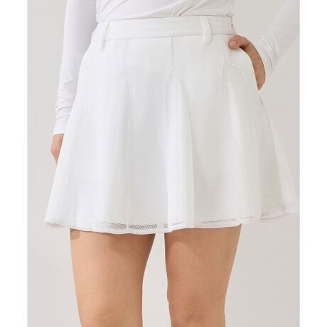 表面にはメッシュ素材、裏側にはUV/吸水速乾機能付き素材を使用した切替フレアスカート。
