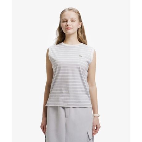 [型番:TF025J-99]クリーンなボーダー柄とレギュラーフィットで、汎用性に優れるノースリーブTシャツ・ややライトウェイトに仕立てたコットンシングルジャージ素材・ベーシックなバイカラーボーダーパターン・適度なゆとりを持たせたレギュラーフィットシルエット・さり気なくあしらったセンターバックの切り替えラインとサイドスリット・左胸にワニロゴパッチを配置Regular Fit