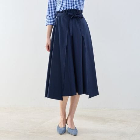 ツイル織りの素材を使用したフレアスカート。サイドから前後にリボンを結び替えることで表情が変わる2通りのデザインを楽しめます。今シーズンは新たなカラー展開に仕上げ、着丈もやや長めに調整することで、よりバランスよく着用できる一着に。きれいめにもカジュアルにも取り入れやすいアイテムです。同素材のジャケット(30-61-22-739)とのセットアップ着用も可能です。