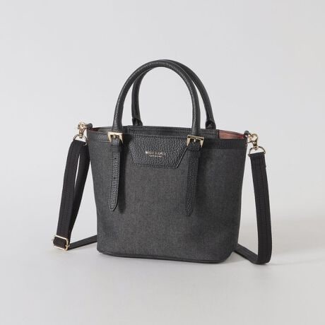 [型番:55132707__]◆小さく見えてしっかり入るミニトートバッグデイリー使いにぴったりな使い勝手の良いミニトートバッグ。シンプルなデニム素材をベースに、ゴールドのバックルをアクセントにしました。ペットボトルがすっぽり入り、長財布もゆとりを持って収納できる頼れるサイズ感が魅力です。