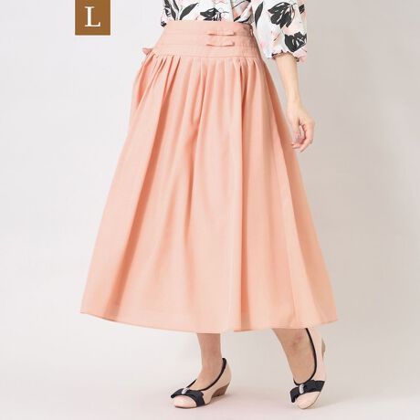 ウエストヨーク幅を広めに設定し、お腹まわりはすっきりとした印象に。後ろヨークのみに平ゴムを入れることで、程よい伸縮性と着用のしやすさを両立しました。フロントヨーク上には共布のリボンをあしらい、さりげないデザインアクセントに。ヨーク下には細かなタックを施し、裾に向かってたっぷりとしたフレア感を演出しています。