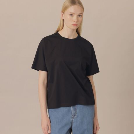 ドルマン袖のプレーンなトップスです。裾、袖口は折り上げ接着する仕立てになっています。また、なだらかな肩傾斜で衿元はシャープに着心地よい仕立てです。同型のボーダー柄(品番:G5P07778)もご用意しております。