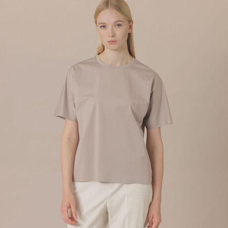 ドルマン袖のプレーンなトップスです。裾、袖口は折り上げ接着する仕立てになっています。また、なだらかな肩傾斜で衿元はシャープに着心地よい仕立てです。同型のボーダー柄(品番:G5P07778)もご用意しております。