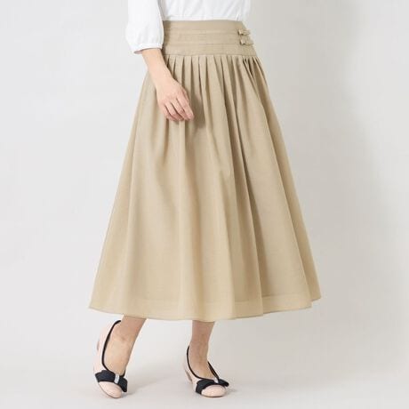 ウエストヨーク幅を広めに設定し、お腹まわりはすっきりとした印象に。後ろヨークのみに平ゴムを入れることで、程よい伸縮性と着用のしやすさを両立しました。フロントヨーク上には共布のリボンをあしらい、さりげないデザインアクセントに。ヨーク下には細かなタックを施し、裾に向かってたっぷりとしたフレア感を演出しています。