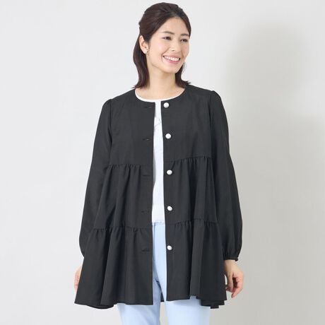 ティアードデザインでヒップが隠れる着丈。前を閉じればチュニックブラウスとして、前を開ければ軽やかな羽織として着用できる2WAY仕様です。春先の軽い羽織としても重宝するアイテム。袖口には平ゴムを通し、袖丈の調整が可能なデザインに仕上げています。