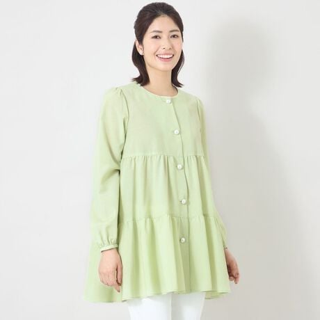 ティアードデザインでヒップが隠れる着丈。前を閉じればチュニックブラウスとして、前を開ければ軽やかな羽織として着用できる2WAY仕様です。春先の軽い羽織としても重宝するアイテム。袖口には平ゴムを通し、袖丈の調整が可能なデザインに仕上げています。