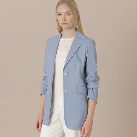 ナローな肩回りと程よく身体から離れたリラックス感のあるシルエットで、プレスが効いたラペルがシャープな印象のジャケットです。着丈が長く裏地がない為、春先にサラッと着用していただけます。
