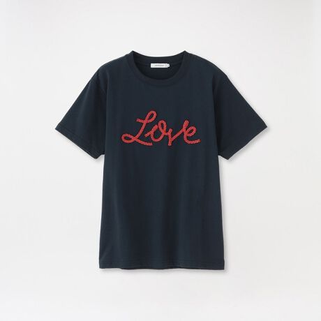 コード刺繍で模られた筆記体「Love」が特徴のTシャツ