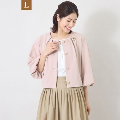 ジョーゼット調とツイル調の表情を掛け合わせ、軽さとふくらみをバランス良く融合したカット素材。ジャージならではの高いストレッチ性に加え、適度なハリ感があり、きれいなシルエットをキープします。快適な着心地と上品な見え方を両立した素材です。