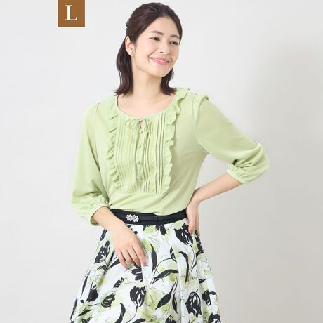 前身頃のヨーク部分に、フリル・タック・細はしごレースを施し、ブラウスのような華やかな表情に仕上げました。伸縮性があるため着心地が良く、シワになりにくいのも嬉しいポイント。きちんと感と快適さを兼ね備えた、デイリーからきれいめスタイルまで幅広く活躍するカットソーです。