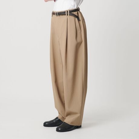 ウールライクなキレイ目の素材感ながらも麻のような肌離れの良さが特徴のワイドパンツ。