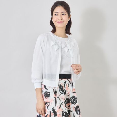 シアー編みのシンプルな襟元に、華やかなビジュー刺しゅうを施したニットカーディガン。前身頃にはチューリップをイメージしたモチーフをあしらい、上品さの中に存在感をプラスしています。羽織るだけでスタイリングを格上げしてくれる一枚です。