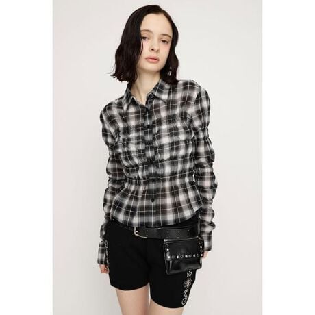 【RANDOM SHIRRING TOPS】■POINT身頃から袖にかけて大胆に入ったランダムシャーリングがスタイリングの主役になるシアーシャツ。程よい肌見せを楽しめる透け感のある素材を使用し、ロングシーズンで着用していただきやすいアイテムへと仕上げました。■DETAILシャーリングによってウエストが自然にシェイプされ、スタイルアップ効果が期待出来ます。軽やかで柔らかい素材を使用したことで、シャーリングが強い印象になりすぎず着やすいアイテムです。無地のホワイト・ライトブルーに加えて、SLYオリジナルで作成したチェック柄のマルチピンクとマルチブラックの4色展開です。チェック柄はそれぞれ配色にこだわり、ヴィンテージライクな雰囲気のアイテムへと仕上げています。■STYLING程よくコンパクトなサイズ感なのでボトムスを選ばず着用していただけます。フロントを閉めてトップスとしても羽織としても使用できるので着回し力抜群です。デニム合わせはもちろん、ミニボトムスとのスタイリングもおすすめです。■FABRIC/MATERIAL透け感のある柔らかいコットンライクのポリエステル素材を使用。■透け感:あり■光沢感:なし■伸縮性:シャーリング部分のみあり■裏 地:なし[注意事項]※画像の商品はサンプルです。実際の商品と仕様、加工が若干異なる場合があります。※画像の商品は光の照射や角度、お使いのモニター環境により、実物と色味が異なる場合がございます。※着用、お取り扱いの際は、アテンションタグをご確認ください。※一部予約商品につきましては生産上の都合によりお届け予定日や店頭発売と前後する場合もございます。※追加生産商品は、一部の店舗、通販で販売中の場合がございます。予めご了承下さい。