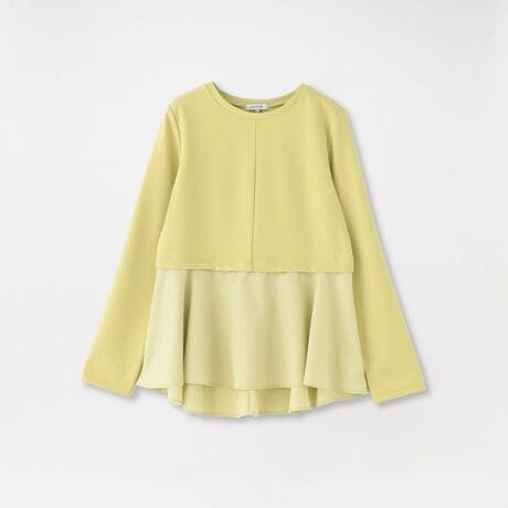 コンパクトなトップスに異素材のペプラムが広がるドッキングデザイン。