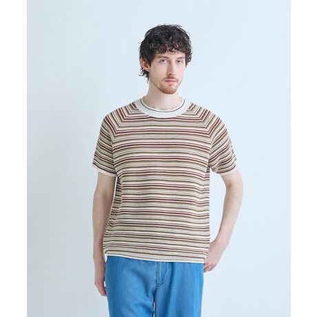 ニットでしか表現できないマルチカラーのボーダー柄が特徴で、独特の質感が肌に心地よく、汗ばむ季節でもベタつきを抑えて清涼感を保ってくれる機能性と意匠性を兼ね備えた一着です。