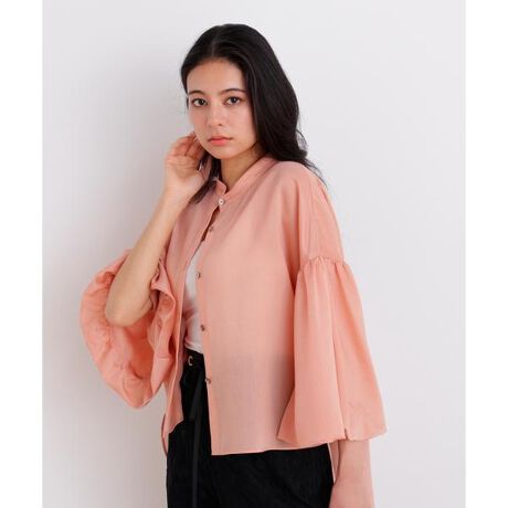 すっきりとしたスタンドカラーが洗練された印象を演出する一枚。身頃はややゆとりのあるシルエットで、袖のバルーンスリーブが華やかなアクセントを添えます。軽やかなシアー素材を使用しているため、ゆったりとしたサイズ感でも重くならず、軽快に着用いただけます。ボタンを開けて羽織りとしてはもちろん、フロントイン・バックアウトのスタイリングもスタイリッシュに決まります。
