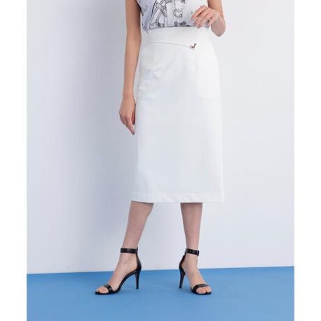中肉の2WAYストレッチ素材で仕立てたタイトスカート。ウエストにメタルパーツが付いた綺麗なシルエットのタイトスカートです。ベルト端のL字メタルパーツのきれいめエレガンスなディテールが目を引きます。ウエストの高い位置にポイントを集めることで、スタイルアップ効果抜群のスカートに仕上げました。