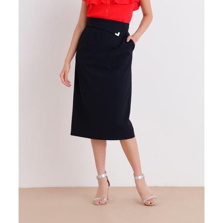 中肉の2WAYストレッチ素材で仕立てたタイトスカート。ウエストにメタルパーツが付いた綺麗なシルエットのタイトスカートです。ベルト端のL字メタルパーツのきれいめエレガンスなディテールが目を引きます。ウエストの高い位置にポイントを集めることで、スタイルアップ効果抜群のスカートに仕上げました。