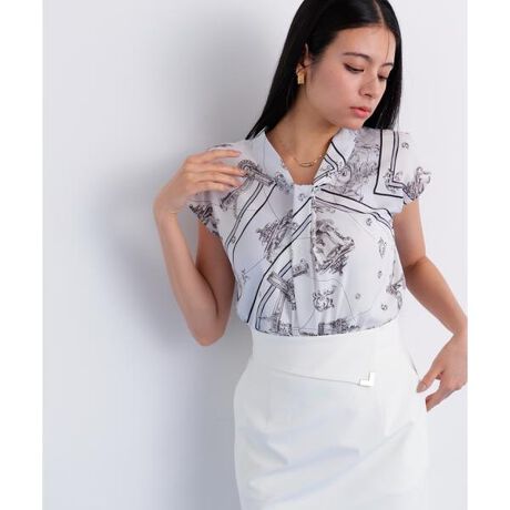 タイ風のタックドレープを施したプリントブラウス。首元は、詰まり過ぎないスタンドカラーで、かぶって着用できます。見せかけのタイデザインなので、整える手間もなく、忙しい朝に簡単にスタイルが決まります。肩回りが隠れ、二の腕が細く見える丈感のフレンチスリーブです。フロント・バックとも、タックで身頃に余裕があるので、インしたときにブラウジングが決まりやすいデザインです。同じ柄のプリントスカートとセットアップでもお召し頂けます。