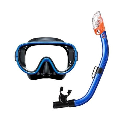 スタンダード1眼マスクとドライスノーケルをセットにした高機能タイプ。 男女兼用10歳-大人用。 Wスカート構造は接地面が広がる特殊加工で肌に吸い付くようにぴったりフィットし、水の浸入を防ぎます。 ストラップの調節をワンタッチで簡単に行うことができる。 まがりパイプによって水の抵抗によるパイプのブレを軽減。 ドライスノーケル機能は水中に入るとフタをして水の侵入を防ぎます。 水面では吸気パイプに水が入りにくい構造でストレスを軽減させます。 軽く息を吹くだけでパイプ内の水を楽に排水できる排水弁付き。 水の抵抗を最小限に抑えるよう設計された流線5角形構造。