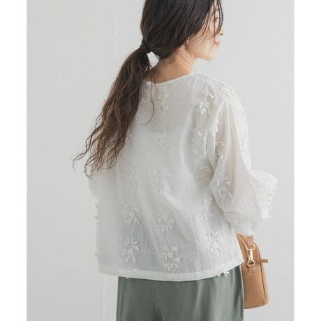 立体的な刺繍が施された生地が魅力のブラウスは、シンプルながらも華やかさをプラスしてくれる一着。