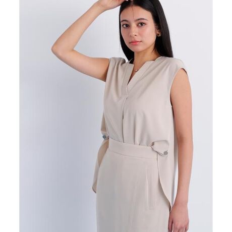 デコルテラインでカッティングされたV ネックがシャープ見えするブラウス。ゆったりとたTシャツのようなシルエットでリラックス感を与えつつ、サイドメタルボタンをあしらって上品な印象に仕上げています。ラウンドさせた前後差レングスもポイントで同素材のパンツと合わせたフロントINした着こなしは、サイドのボタンとパンツのDカンのメタルがアクセントとなって更に上品見えしておすすめです。