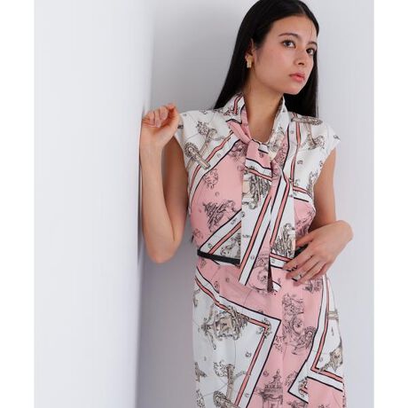 エレガンスな印象のスカーフ柄が目を惹くワンピース。身体のラインに程よくフィットしたシルエットでサイドにあしらったラップ風デザインが、動く度に軽やかに揺れ女性らしいニュアンス感を演出します。後ろ裾には切り替えとタックディティールでマーメイドのシルエットを作り、前から見ても後ろから見ても美しいシルエットを作りました。首元には同柄のボウタイを添えて更に知的な雰囲気をプラス。