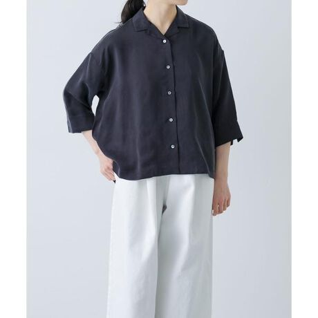 日々のスタイリングに重宝する開襟シャツ。とろみのある質感が特徴的なキュプラ素材でご用意しました。肘がしっかりと隠れる半端袖が大人好みなデザインです。コンパクトなオープンカラーはボタンを上まで留めるとレギュラーカラーに早変わり。カジュアルながらもきちんとした雰囲気があり上品さをまとっています。バランスが取りやすい丈なのでスカートにもパンツにも好相性。前を開けて羽織りとしても着用可能です。