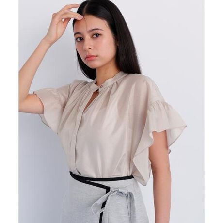 すっきりとしたスタンドカラーが洗練された印象を与える一枚。ややゆとりのあるシルエットに、袖のラッフルデザインが女性らしい華やぎを添えます。前後差のあるレングスがスタイリングをスタイリッシュに仕上げ、フロントボタンを開ければ羽織りとしてもバランスよく着用いただけます。軽やかなシアー素材が、コーディネートに抜け感をプラスします。