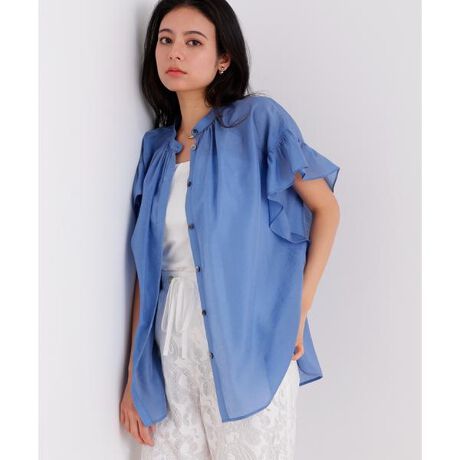 すっきりとしたスタンドカラーが洗練された印象を与える一枚。ややゆとりのあるシルエットに、袖のラッフルデザインが女性らしい華やぎを添えます。前後差のあるレングスがスタイリングをスタイリッシュに仕上げ、フロントボタンを開ければ羽織りとしてもバランスよく着用いただけます。軽やかなシアー素材が、コーディネートに抜け感をプラスします。