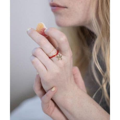 パッと目を惹く赤いビーズリングと可愛らしいお花モチーフがセットになった、遊び心たっぷりのアイテム。