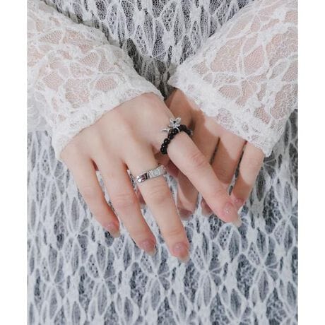 パッと目を惹くブラックビーズのリングと、ロゴ入りのメタルプレートが印象的なメタルリングのセットアイテムです。