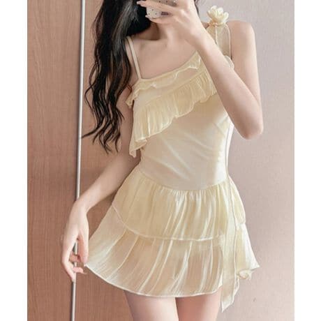 シアーフリルとリボンデザインが魅力のフェミニンなワンピース水着。